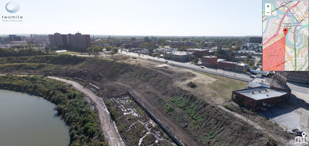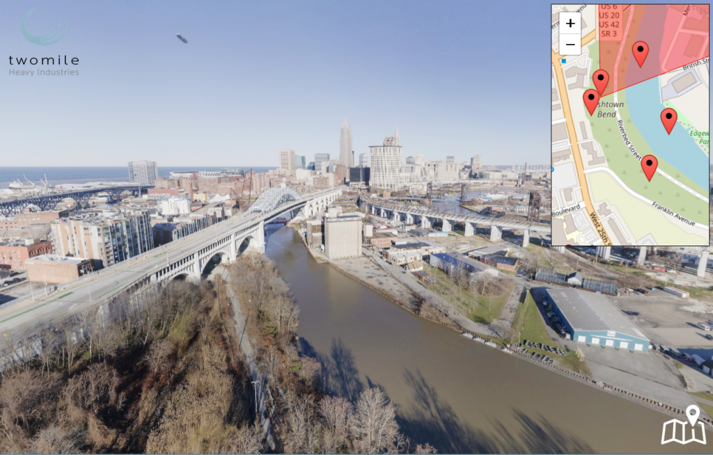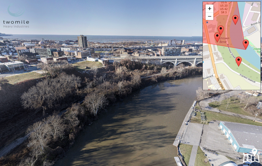 These aerial panoramas provide interactive 360-degree perspectives from above the Irishtown Bend site, along the Cuyahoga River in Cleveland, Ohio, USA. The virtual tour interface includes a simple, intuitive map to show the location and orientation of each view.