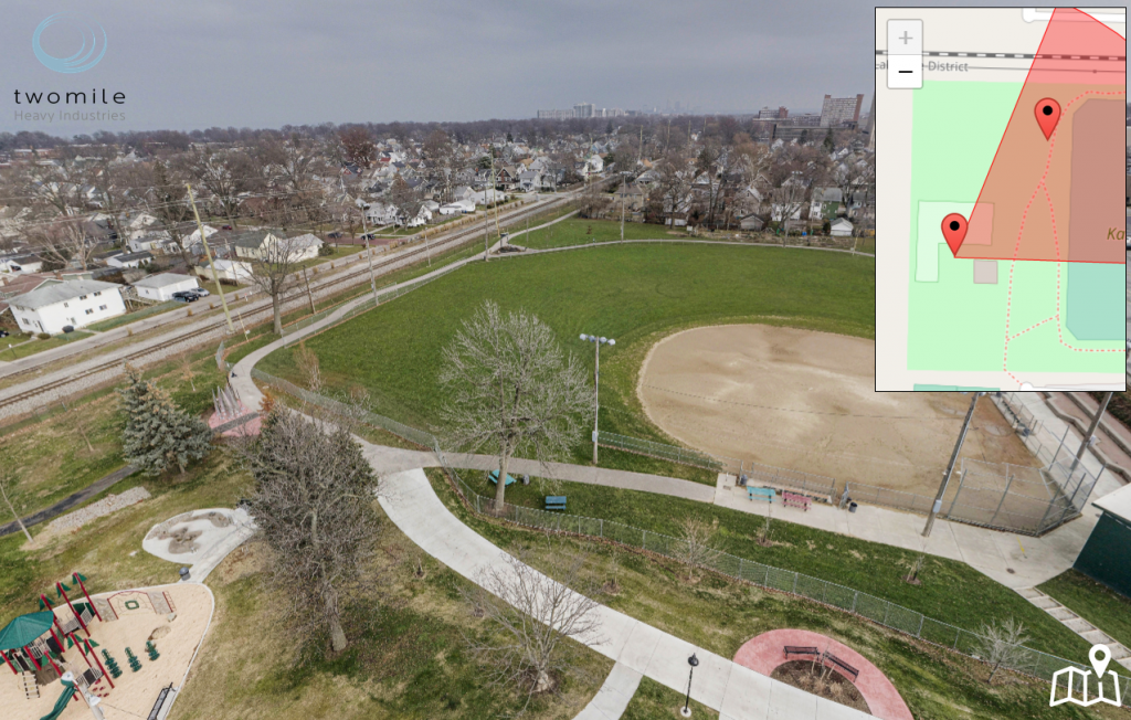 These aerial panoramas provide two interactive 360-degree perspectives from above Kauffman Park in Lakewood, OH, USA. The virtual tour interface includes a simple, intuitive map to show the location and orientation of each view. Panoramas were captured in December 2021.