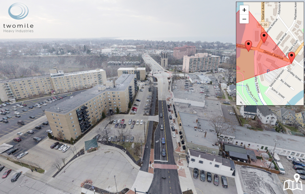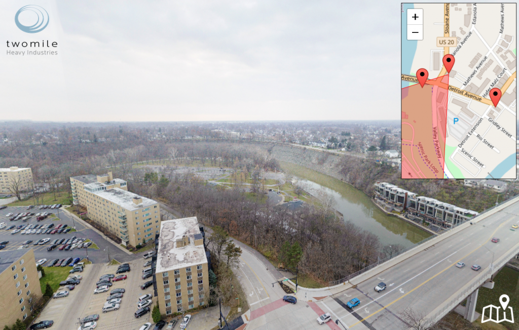 Twomile creates aerial 360-degree panoramas and virtual tours to support urban design and engineering. Our virtual tours connect high-resolution aerial views using a simple, intuitive map interface. Tours are hosted on our secure cloud infrastructure. To see more examples, click here.